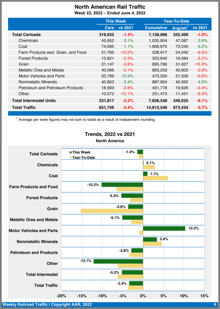For week 22, ending June 4, 2022, four of the 10 carload commodity groups posted an increase compared with the same week in 2021. They included grain, up 2,515 carloads, to 23,867; motor vehicles and parts, up 1,385 carloads, to 12,518; and nonmetallic minerals, up 562 carloads, to 29,778. Commodity groups that posted decreases included metallic ores and metals, down 3,222 carloads, to 20,192; miscellaneous carloads, down 1,468 carloads, to 8,037; and farm products excluding grain, and food, down 887 carloads, to 14,510.