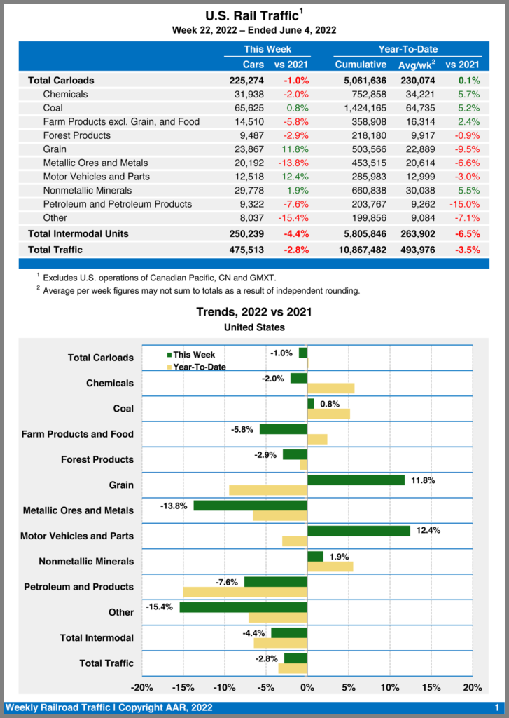 For the first 22 weeks of 2022, U.S. railroads reported cumulative volume of 5,061,636 carloads, rising 0.1% from the same point last year; and 5,805,846 intermodal units, falling 6.5%. Total combined U.S. traffic for the first 22 weeks of this year was 10,867,482 carloads and intermodal units, a 3.5% drop from 2021.
