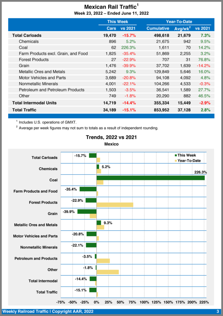 Mexican railroads reported 19,470 carloads for the week, down 15.7% compared with the same week last year, and 14,719 intermodal units, down 14.4%. Their cumulative volume for the first 23 weeks of 2022 was 853,952 carloads and intermodal containers and trailers, up 2.8% from the year-earlier period.