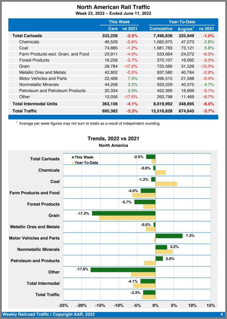 For Week 23, total U.S. weekly rail traffic came in at 510,295 carloads and intermodal units, decreasing 3.6% from the same week in 2021. U.S. Class I railroads moved 234,942 carloads, down 2.8% from last year; and 275,353 containers and trailers, down 4.4%, according to AAR.