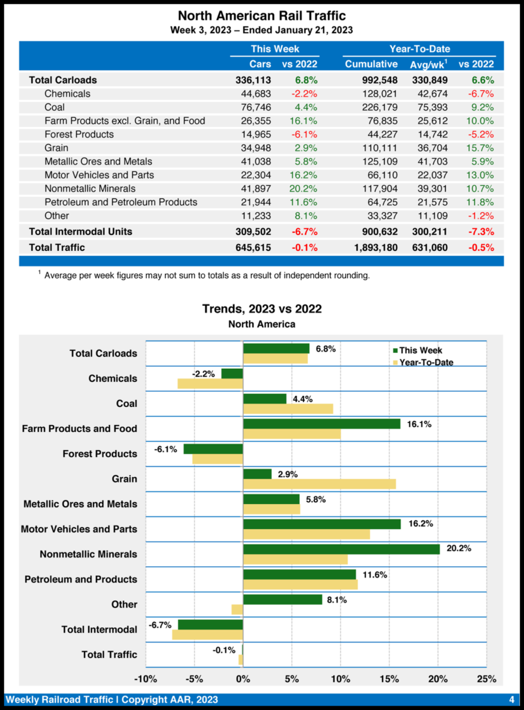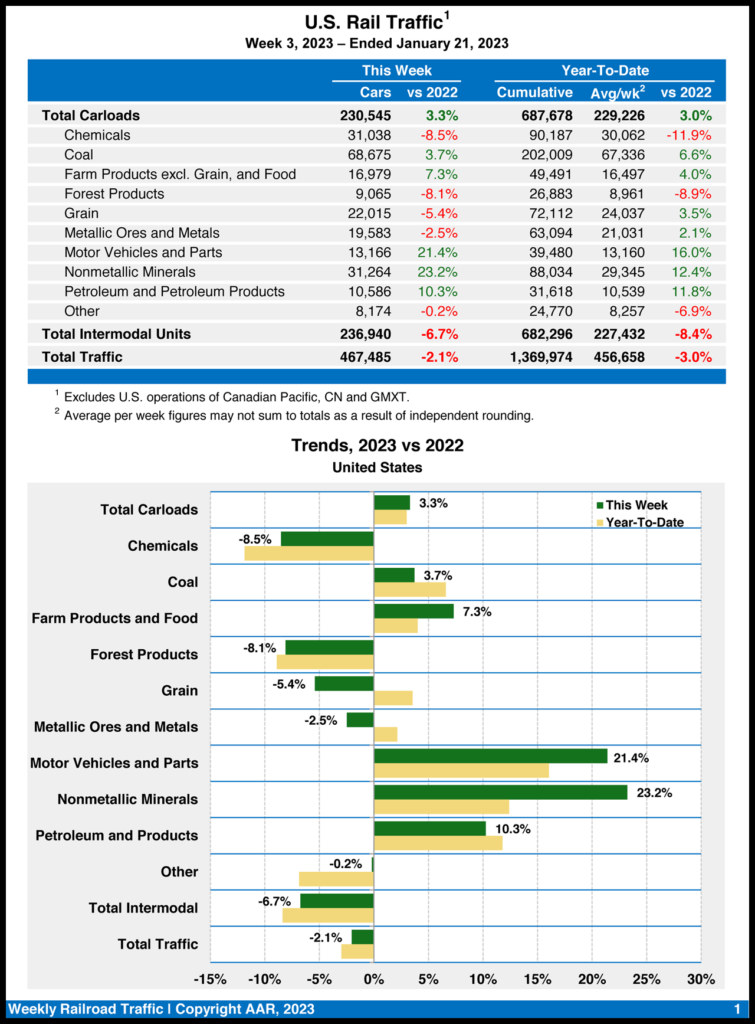 For the week ending Jan. 21, 2023, total U.S. weekly rail traffic came in at 467,485 carloads and intermodal units, comprising 236,940 containers and trailers (down 6.7% from the same week in 2022) and 230,545 carloads (up 3.3% from 2022), AAR reported.