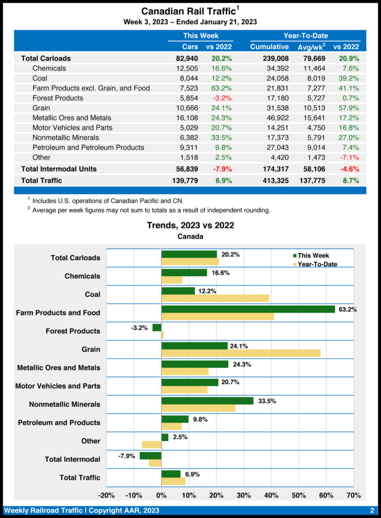 Canadian railroads reported 82,940 carloads for the week ending Jan. 21, 2023, a 20.2% boost over the same week in 2022, and 56,839 intermodal units, a 7.9% decline from last year. For the first three weeks of 2023, they reported cumulative rail traffic volume of 413,325 carloads, containers and trailers, up 8.7%.