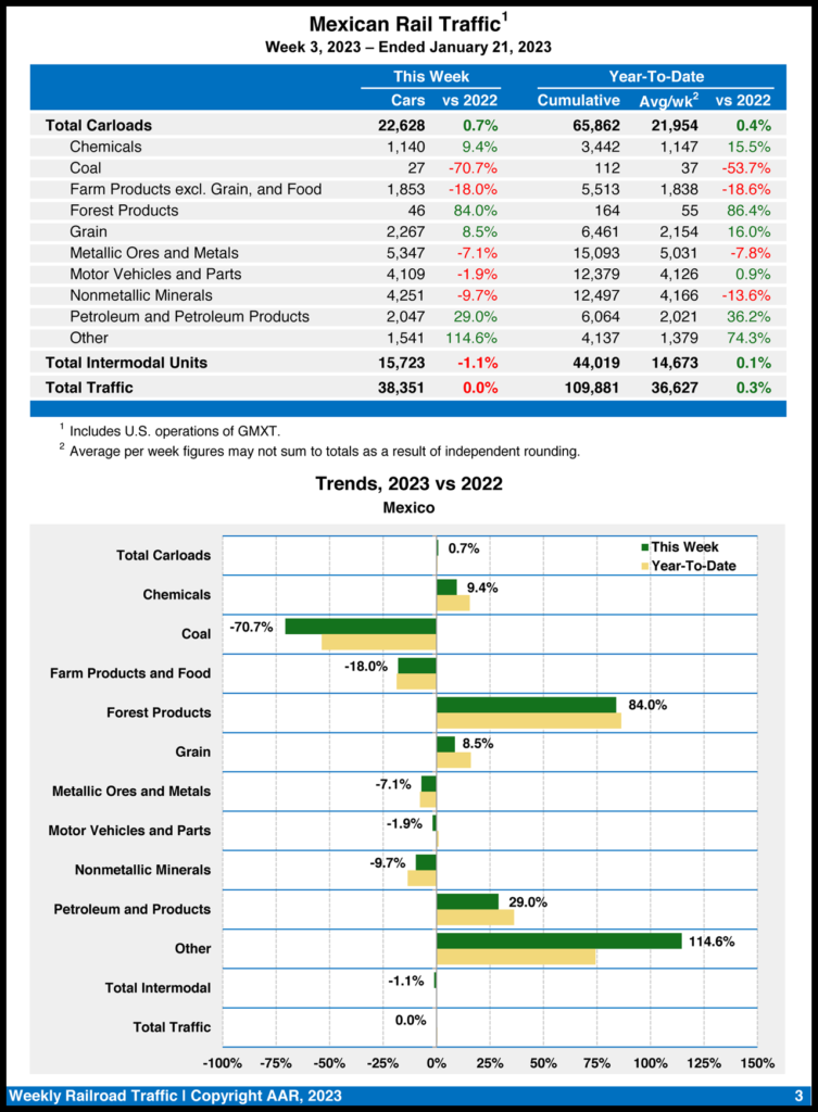 Mexican railroads reported 22,628 carloads for the week ending Jan. 21, 2023, up 0.7% compared with the same week last year, and 15,723 intermodal units, down 1.1%. Their cumulative volume for the first three weeks of 2023 was 109,881 carloads and intermodal containers and trailers, up 0.3% from the same week in 2022.