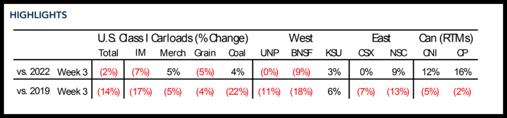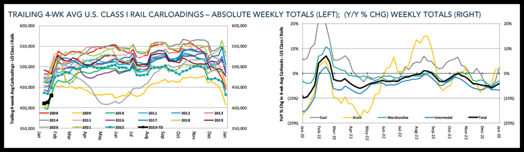 The Chinese New Year holiday falls “within AAR-reported Week 4 of 2023 (Jan. 22), the earliest since 2004,” Bascome Majors wrote in The Rail Report—Week 3 on Jan. 25. “As a result of the holiday timing difference and an assumption of a 3-4 week lag of the holiday’s impact on North American intermodal networks, we expect to see a year-over-year comp-driven headwind in AAR Week 7 or 8 as Chinese New Year-impacted intermodal volumes comp against a ‘super-seasonal’ 2022 week that is less burdened for the Chinese New Year. We expect the declines to be exacerbated vs. last year’s uniquely difficult comp as the massive near-100 ship backlog (at anchor plus slow-steaming from Asia) at Southern California ports conflated any sort of typical seasonality following the Chinese New Year. Additionally in China, the 2023 Chinese New Year is the first since easing of COVID-policies, allowing freer movement of citizens across the country to return to rural areas for the holiday after constraining that opportunity in 2020-2022. As early as week 10, we expect year-over-year volume trends to be past Chinese New Year-related distortions and land at more normalized levels reflecting underlying demand (which isn’t particularly strong right now), although we’ll closely watch for effects of China’s continued economic reopening on port and intermodal volumes as the year continues.”