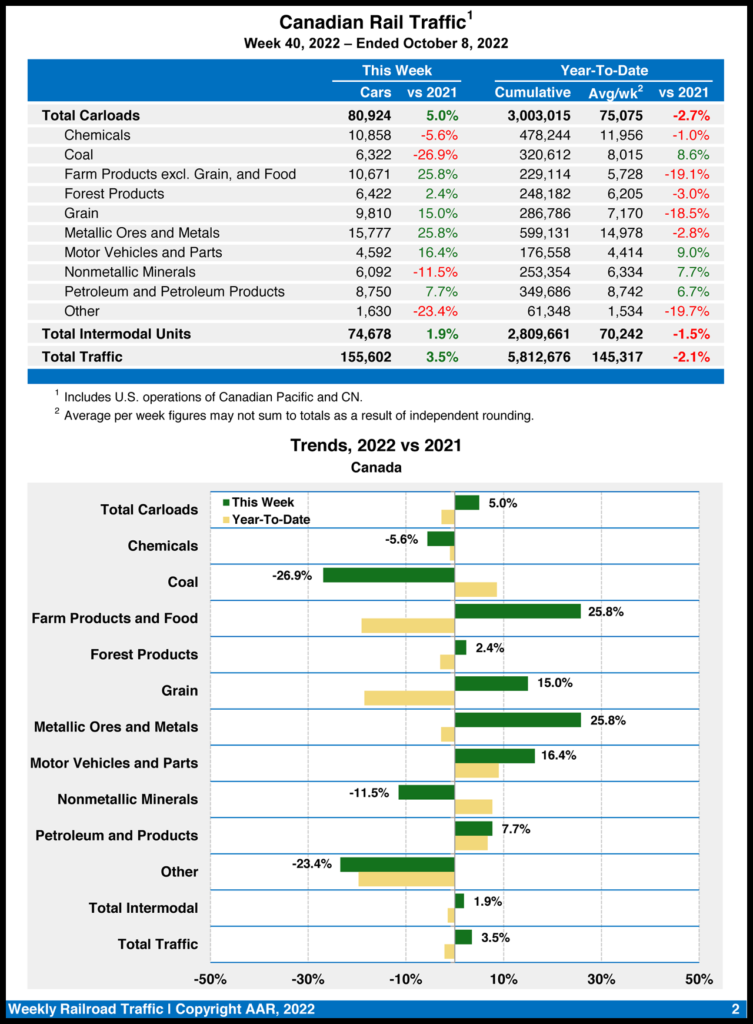 Canadian railroads reported 80,924 carloads for the week, rising 5%, and 74,678 intermodal units, increasing 1.9% from the same week in 2021. For the first 40 weeks of 2022, they reported cumulative rail traffic volume of 5,812,676 carloads, containers and trailers, decreasing 2.1%.