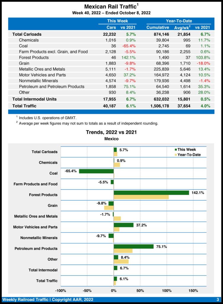 Mexican railroads reported 22,232 carloads for the week, gaining 5.7% over the same week last year, and 17,955 intermodal units, gaining 6.7%. Their cumulative volume for the first 40 weeks of 2022 was 1,506,178 carloads and intermodal containers and trailers, increasing 4% from the same point in 2021.