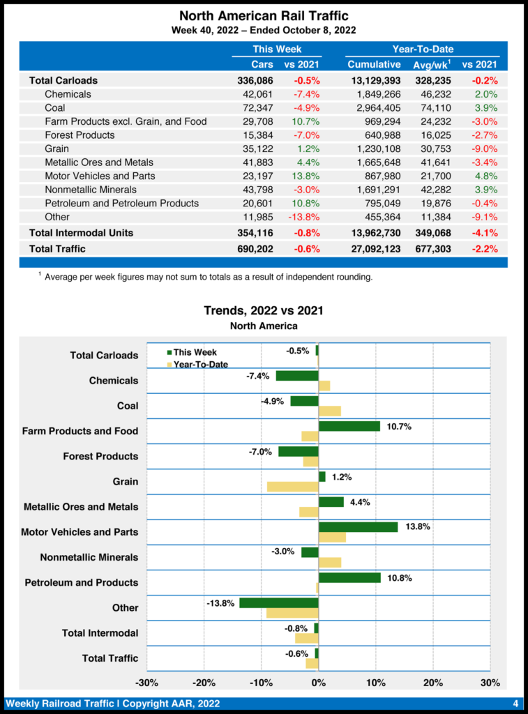 (Results for weeks 38 and 39 were similar. Read: “Intermodal Continues Downward Trend” and “Week 38: U.S. Rail Traffic Behind 2021 Levels.”)