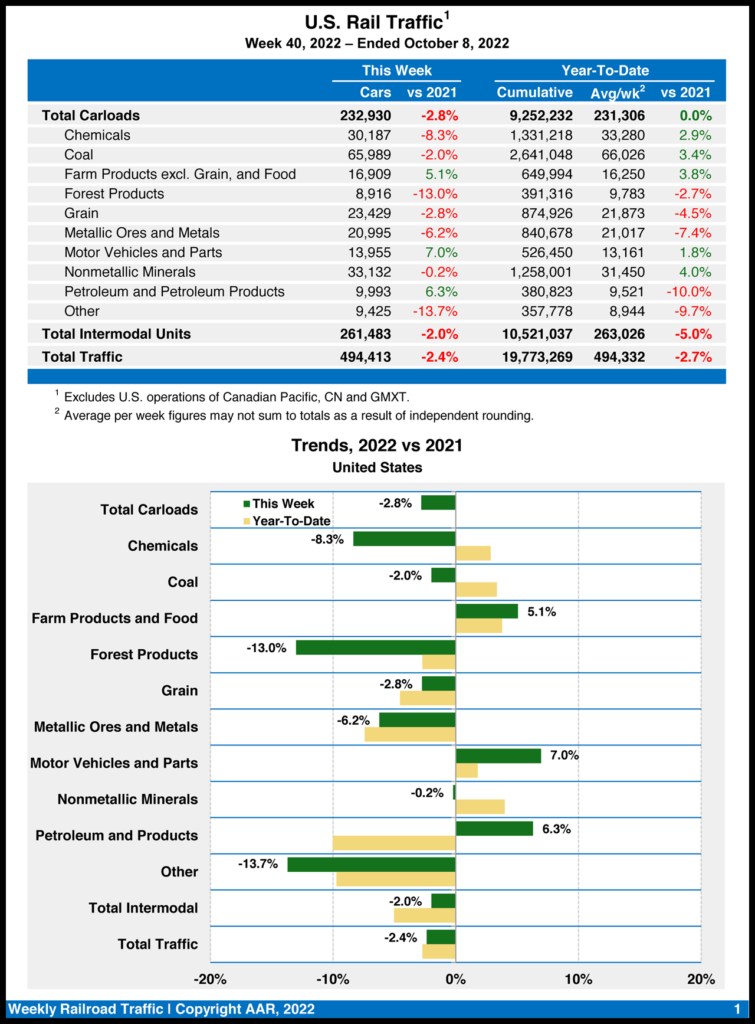 For Week 40, U.S. Class I railroads moved 494,413 carloads and intermodal units, down 2.4% from the same week in 2021, according to AAR. Total carloads came in at 232,930, down 2.8% from last year, while U.S. weekly intermodal volume was 261,483 containers and trailers, down 2%.