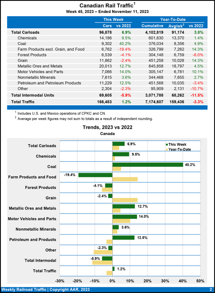 Canadian railroads reported 96,878 carloads for the week ending Nov. 11, 2023, a 6.9% gain, and 69,605 intermodal units, a 5.9% drop compared with the same week last year. For the first 45 weeks of 2023, they reported cumulative rail traffic volume of 7,174,607 carloads, containers and trailers, down 3.3%.