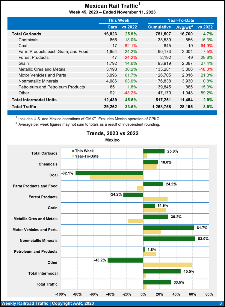 Mexican railroads reported 16,823 carloads for the week ending Nov. 11, 2023, rising 25.9% from the same point in 2022, and 12,439 intermodal units, increasing 45.5%. Their cumulative volume for the first 45 weeks of this year was 1,268,758 carloads and intermodal containers and trailers, up 3.9% from the 2022 period.