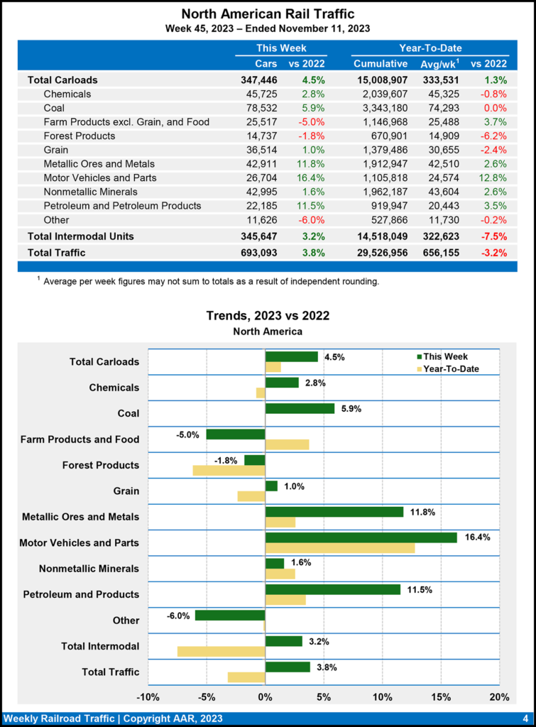 Seven of the 10 carload commodity groups posted an increase for the week ending Nov. 11, 2023, compared with the same week in 2022, the AAR reported. They included coal, up 1,793 carloads, to 69,213; motor vehicles and parts, up 1,707 carloads, to 16,542; and metallic ores and metals, up 1,520 carloads, to 19,705. Commodity groups that posted declines were nonmetallic minerals, down 1,168 carloads, to 31,294; farm products excluding grain, and food, down 113 carloads, to 16,801; and chemicals, down 95 carloads, to 30,673.