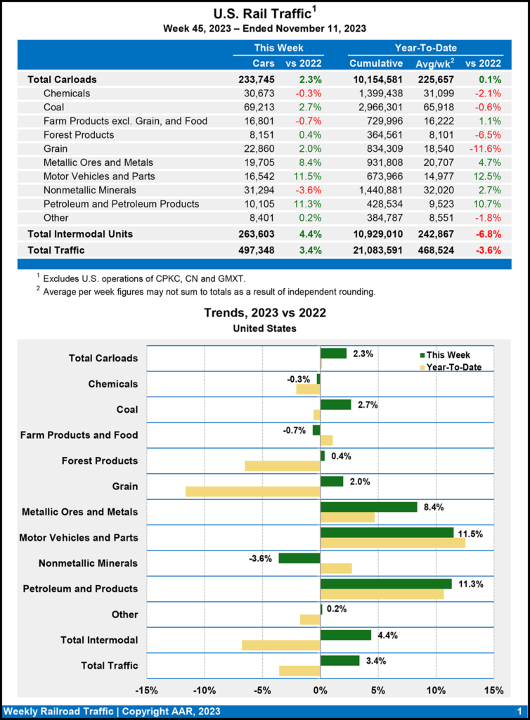 For the week ending Nov. 4, 2023, U.S. Class I’s moved 224,415 carloads, down 5.2% from last year, and 260,342 containers and trailers, up 1.5% from last year.