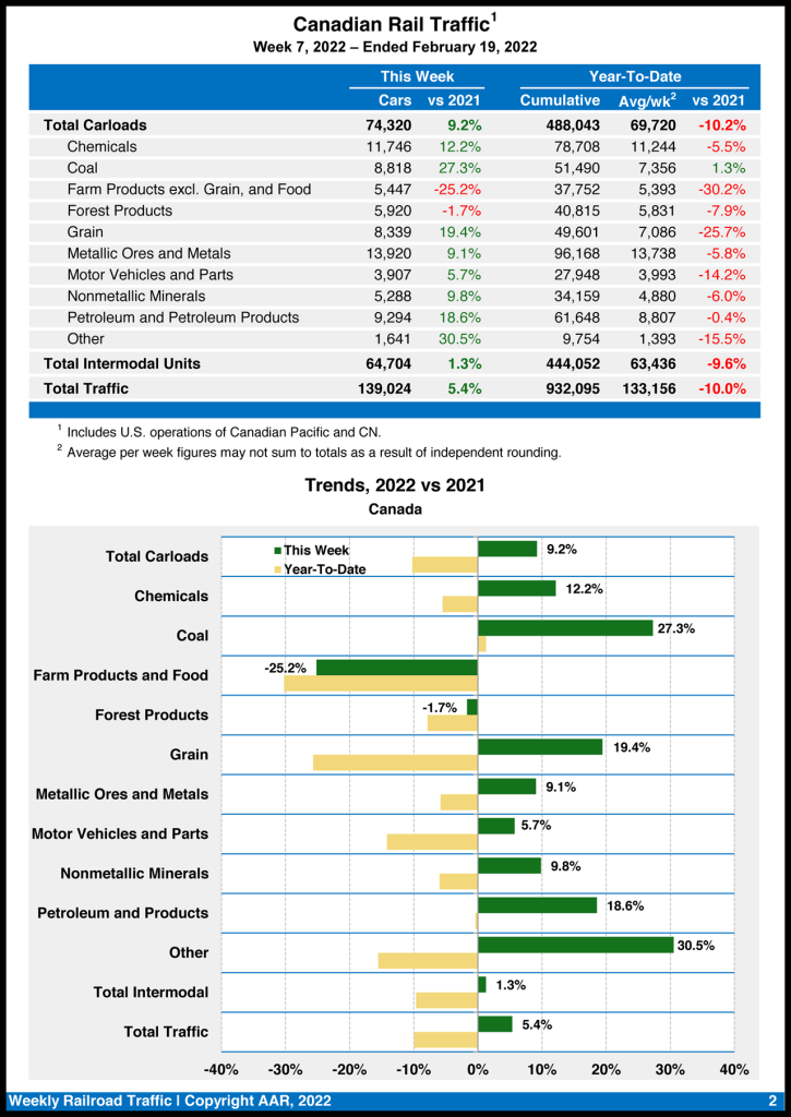 Canadian railroads reported 74,320 carloads for the week, a 9.2% gain, and 64,704 intermodal units, a 1.3% increase vs. the same week in 2021. For the first seven weeks of 2022, they reported cumulative rail traffic volume of 932,095 carloads, containers and trailers, dropping 10.0%.