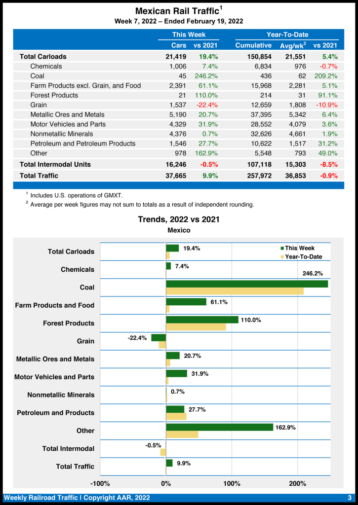 Mexican railroads reported 21,419 carloads for the week, increasing 19.4% from the same week in 2021, and 16,246 intermodal units, dipping 0.5%. Their cumulative volume for the first seven weeks of 2022 was 257,972 carloads and intermodal containers and trailers, down 0.9% from the prior-year period.