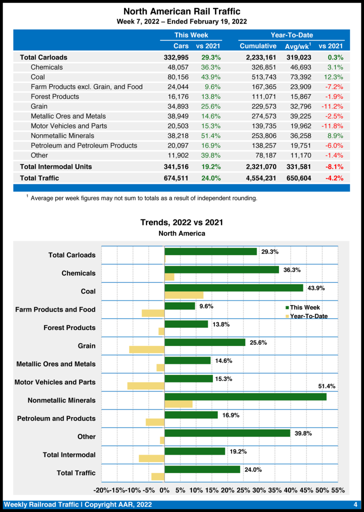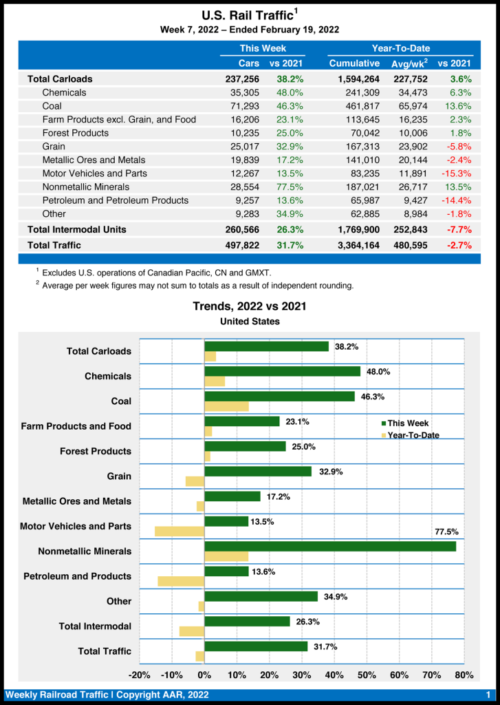 U.S. rail traffic for the week ending Feb. 19, 2022, came in at 497,822 carloads and intermodal units, rising 31.7% from the same week last year, based on 237,256 carloads—up 38.2% from 2021—and intermodal volume of 260,566 containers and trailers—up 26.3%, the Association of American Railroads (AAR) reported on Feb. 23.