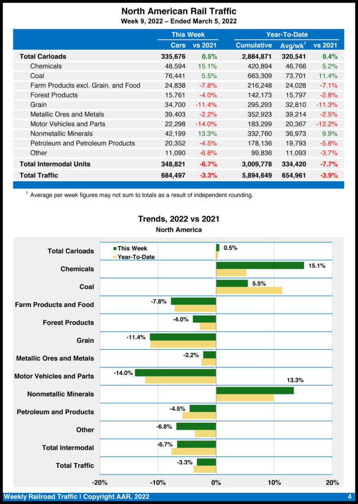 North American rail volume for the week ending March 5, 2022, on 12 reporting U.S., Canadian and Mexican railroads totaled 335,676 carloads, up 0.5% vs. the same week last year, and 348,821 intermodal units, down 6.7% vs. 2021. Total combined weekly rail traffic in North America was 684,497 carloads and intermodal units, falling 3.3%. North American rail volume for the first nine weeks of 2022 was 5,894,649 carloads and intermodal units, decreasing 3.9% from 2021.