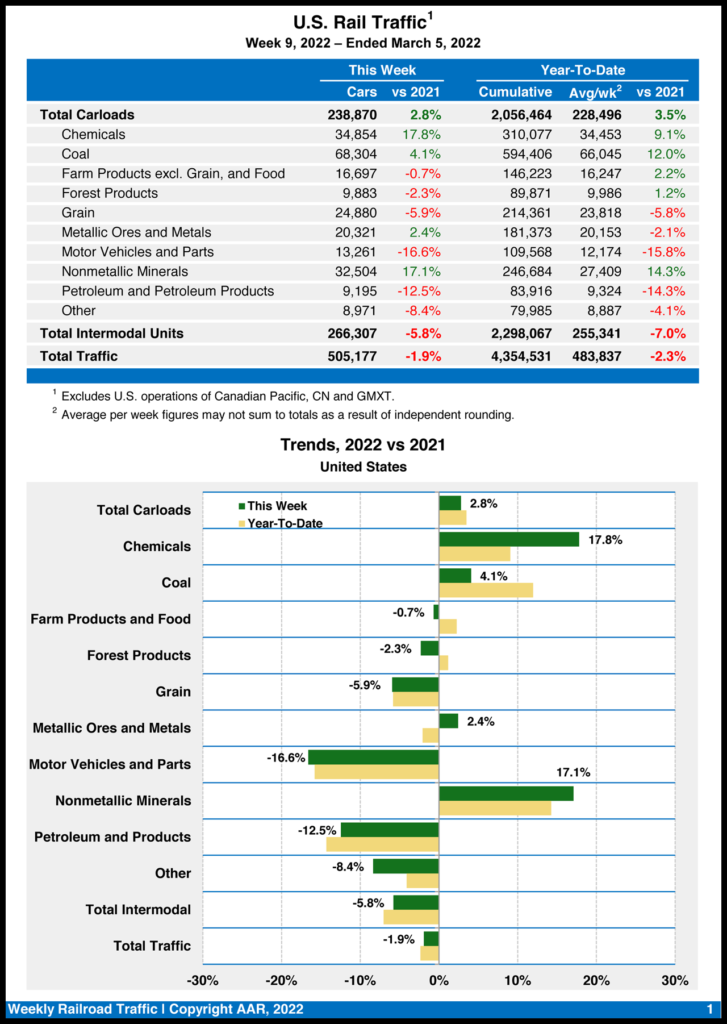 Results for week 8 (ending March 5, 2022) were more in line with the prior-year period; February 2022 results—with double-digit gains—were skewed due to severe winter storms holding back volumes in February 2021, according to AAR.