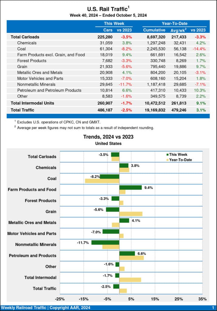 Total U.S. weekly rail traffic was 486,187 carloads and intermodal units, down 2.5% compared with the same week last year, the Association of American Railroads reported for the week ending Oct. 5, 2024.