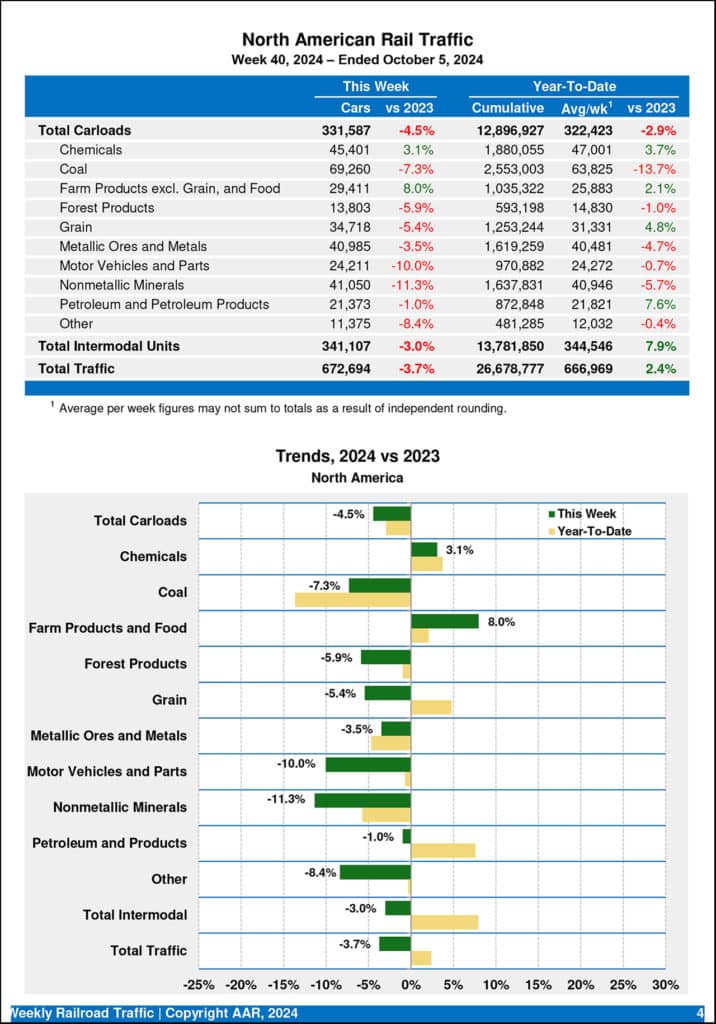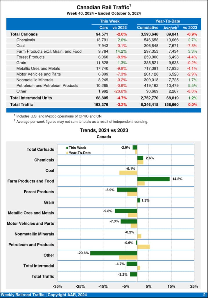 Canadian railroads reported 94,571 carloads for the week, down 2.0%, and 68,805 intermodal units, down 4.7% compared with the same week in 2023. For the first 40 weeks of 2024, Canadian railroads reported cumulative rail traffic volume of 6,346,418 carloads, containers and trailers, down 0.0%.