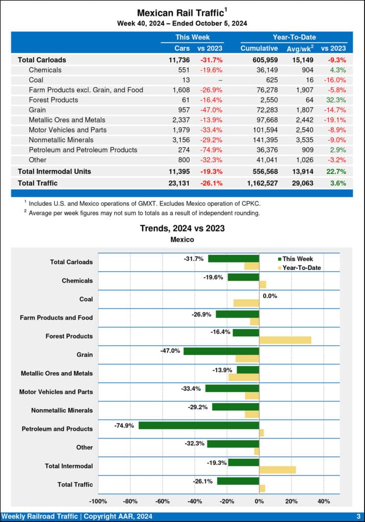 Mexican railroads reported 11,736 carloads for the week, down 31.7% compared with the same week last year, and 11,395 intermodal units, down 19.3%. Cumulative volume on Mexican railroads for the first 40 weeks of 2024 was 1,162,527 carloads and intermodal containers and trailers, up 3.6% from the same point last year.