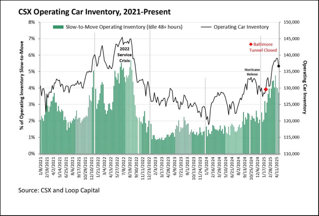 In the week ending April 25, CSX booked a second week of progress fighting back from a trough in network efficiency in early April, including a 33-month low in average train speed. The two primary inhibitors to a full recovery are the reroutes around the closed Howard Street Tunnel in Baltimore, which likely won’t reopen until Q4, and the working down of operating car inventory to declutter the network. The latter requires some help from customers, who own or lease most of the cars, but it’s at least something CSX can influence and make progress on while we wait for the tunnel.