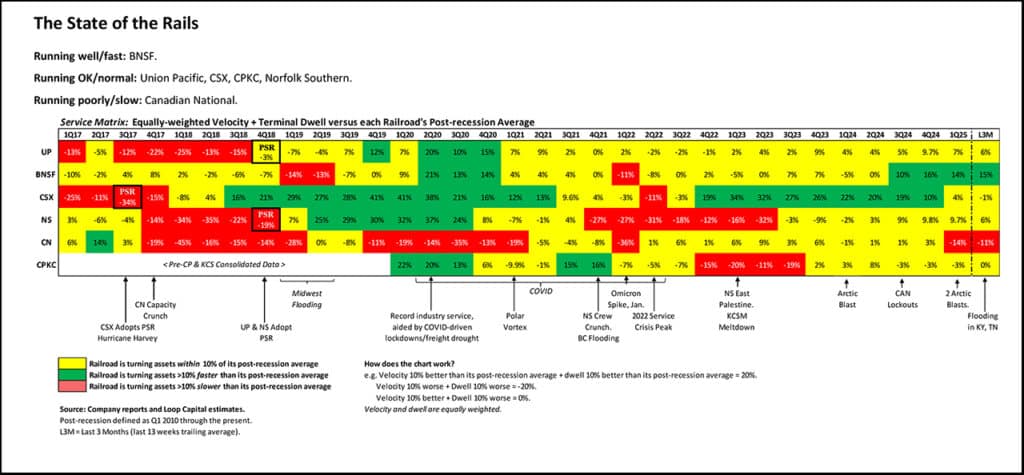 Ideally you want to feed higher volumes into efficiently running networks, converting them to earnings at a high rate, but unfortunately we’ll soon be playing defense on volumes, given high tariffs and higher uncertainty. While we wait for more clarity on trade policy, the Western railroads can still use improving service levels to bolster customer confidence and competitiveness with truck. Remember the big picture here: 14 meltdowns since 2013 and the industry is engaged in a giant customer confidence restoration project to try to win back some share of wallet vs. trucks. CSX recently let the team down, but if the two biggest dogs in the space can extend and improve their service track records through 2025, that wouldn’t be a bad outcome and consolation prize in the event tariffs thwart volume growth over the balance of the year. Never let a crisis go to waste.