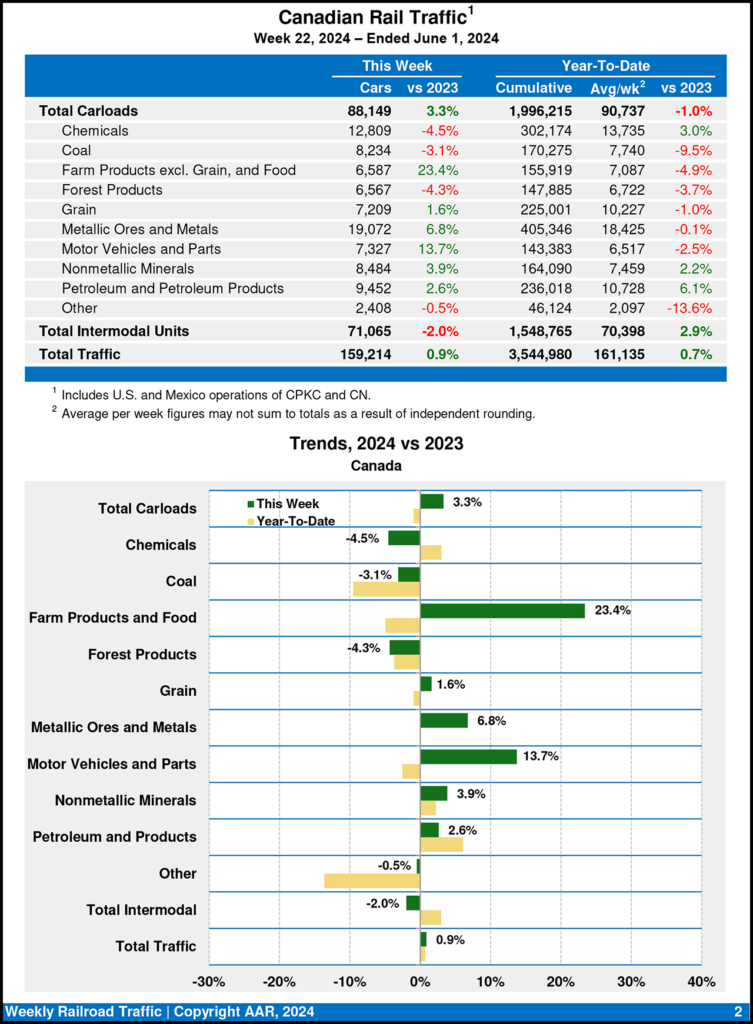 Canadian railroads reported 88,149 carloads for the week ending June 1, 2024, up 3.3%, and 71,065 intermodal units, down 2.0% from the same point last year. For the first 22 weeks of this year, they reported cumulative rail traffic volume of 3,544,980 carloads, containers and trailers, up 0.7%.
