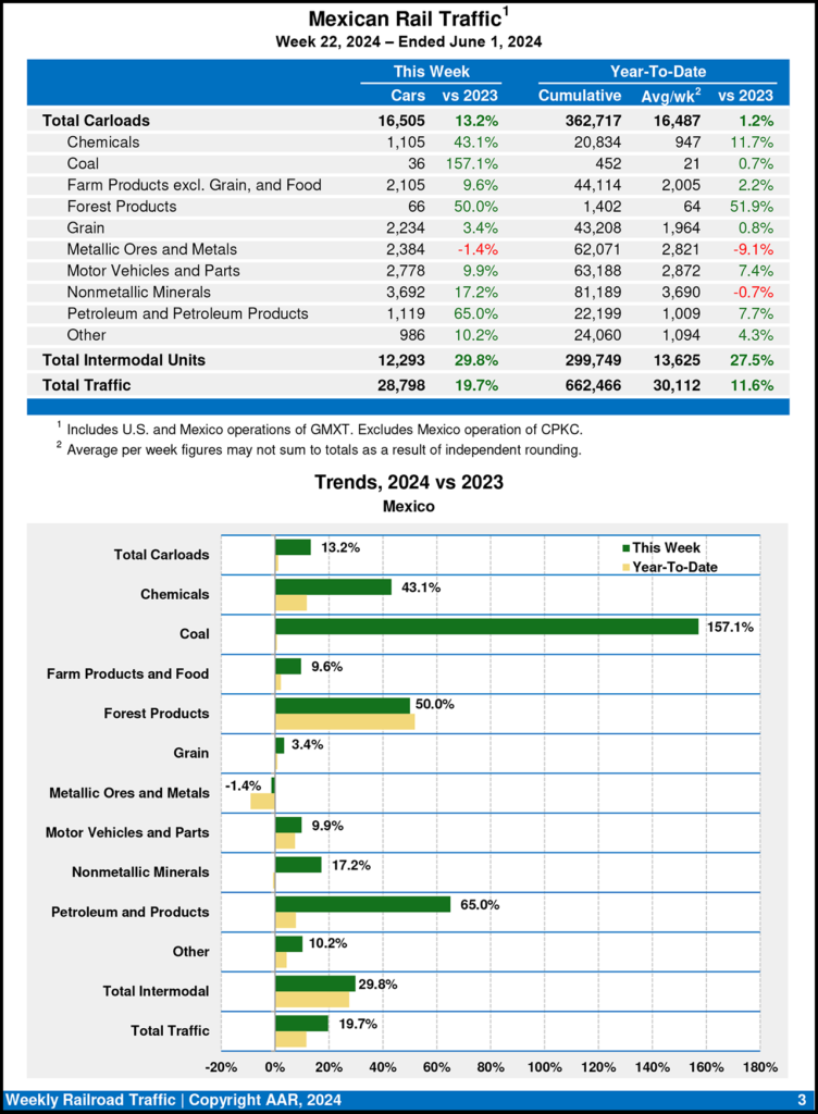 For the week ending June 1, 2024, Mexican railroads reported 16,505 carloads, a 13.2% bump up from the same week last year, and 12,293 intermodal units, a 29.8% gain over last year. Their cumulative volume for the first 22 weeks of 2024 was 662,466 carloads and intermodal containers and trailers, rising 11.6% from the prior-year period.