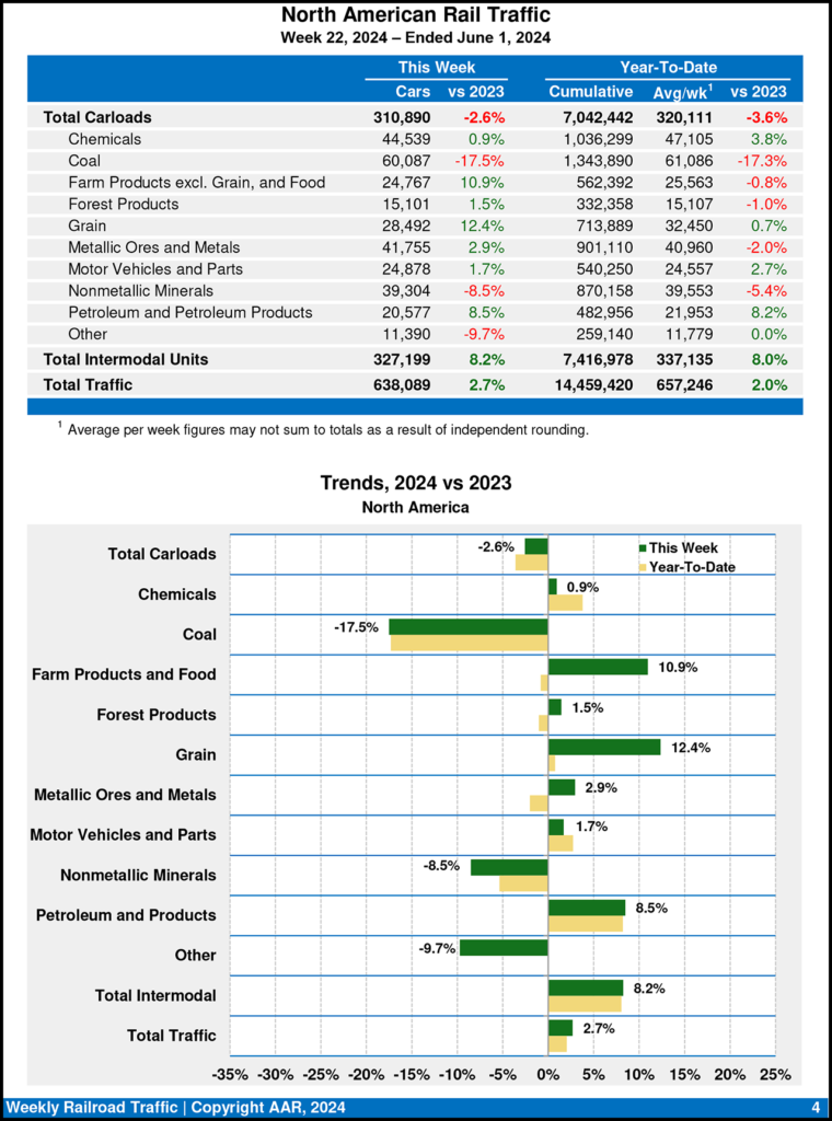 North American rail volume for the week ending June 1, 2024, on 10 reporting U.S., Canadian and Mexican railroads totaled 310,890 carloads, dipping 2.6% from the same week in 2023, and 327,199 intermodal units, increasing 8.2% from last year. Total combined weekly rail traffic in North America was 638,089 carloads and intermodal units, up 2.7%. North American rail volume for the first 22 weeks of this year came in at 14,459,420 carloads and intermodal units, up 2.0% from 2023.