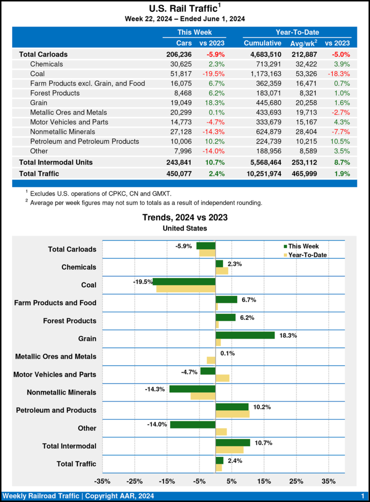 Total combined U.S. traffic for the first 22 weeks of this year was 10,251,974 carloads and intermodal units, a 1.9% gain over 2023.