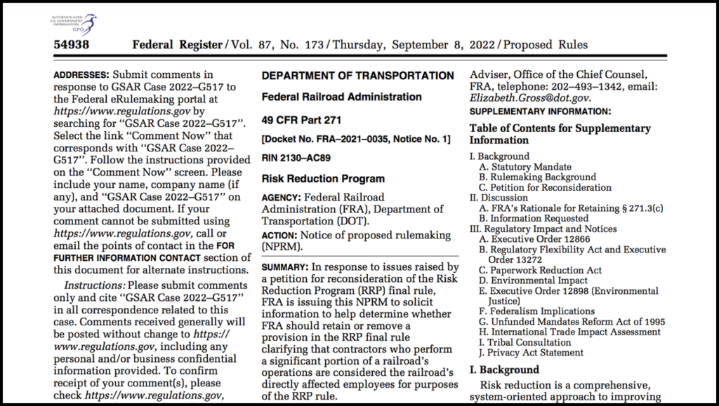 According to FRA’s Sept. 8, 2022 Federal Register report, the RRP final rule “does not contain a definition for ‘directly affected employee.’ However, the rule clarifies in § 271.3(c) that ‘[i]f a railroad contracts out significant portions of its operations, the contractor and the contractor’s employees performing the railroad’s operations shall be considered directly affected employees for purposes of this part.’”