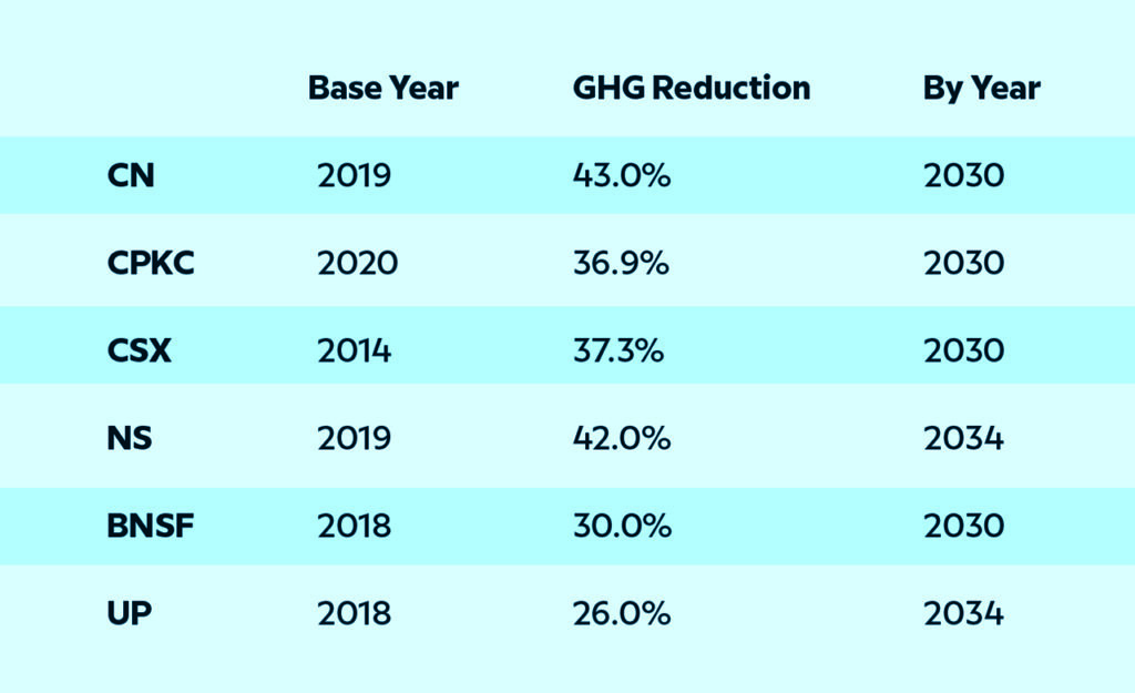 Due to their impact on warming the earth’s atmosphere and the world emphasis on reducing GHG, all Class I’s announced GHG reduction goals in 2019. Outside corporate boardrooms, little is known about how these goals were developed other than the Association of American Railroads (AAR) reports that they are Science Based Target initiatives (SBTi). The table below reflects GHG reduction goals for each major railroad: