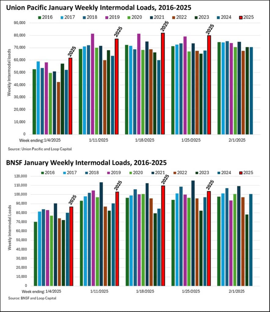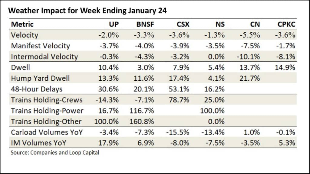 In general, the hit the railroads took was modest compared to prior polar vortexes in 2014, 2019 and 2021, for a couple of reasons. First, and most important, the industry entered the cold snap in good shape with sufficient critical resources and decent fluidity. The better they go in, the better they come out. Second, the polar vortex simply wasn’t as bad as advertised. In a railroad context we define a polar vortex as a period of extreme cold sufficient to trigger the widespread shortening in train length, due to the impact on air braking systems, which in turn creates a capacity crunch. That just didn’t happen, so while the weather system was, technically, a polar vortex, it was really an arctic blast in a rail context. Regardless of what we call it, it’s history now and bullet dodged.
