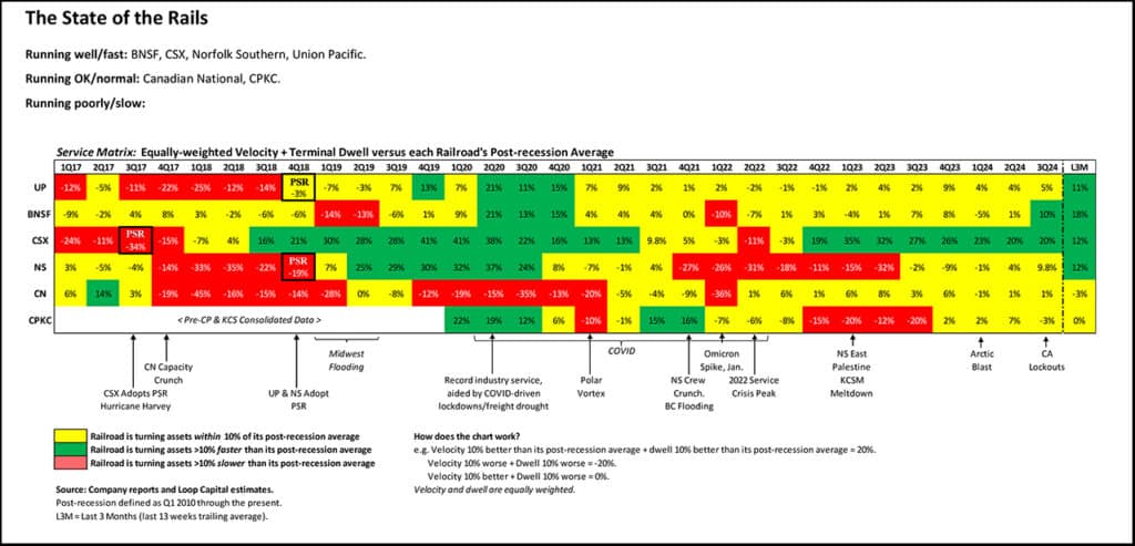 Regarding the other railroads, note the hit the Eastern rails took in terms of carload volumes, down 15.5% at CSX and 13.4% at Norfolk Southern, and double-digit dwell increases at CN and CPKC. But NS demonstrated some more resiliency in the form of the smallest impact on average train speeds.