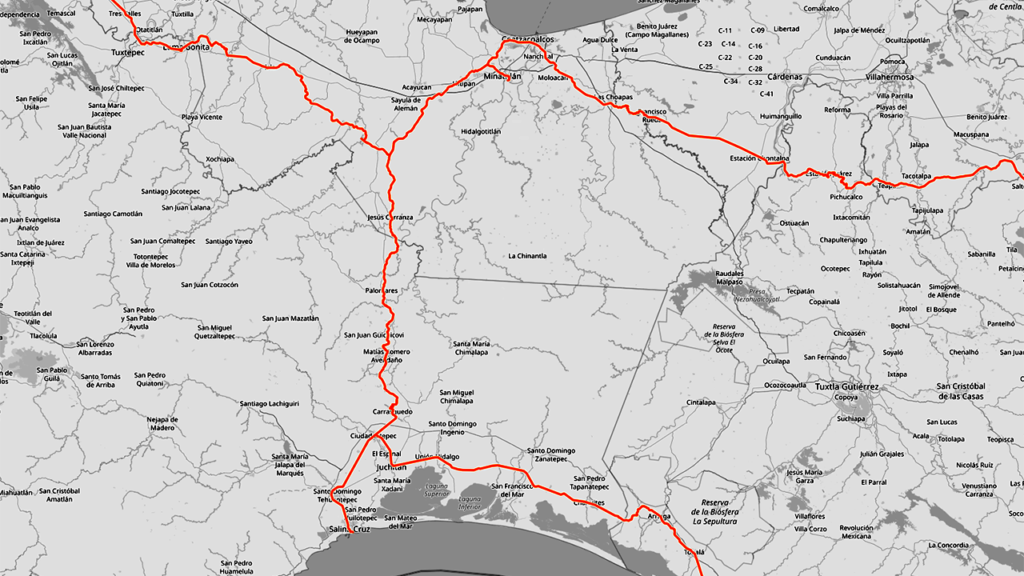 The GMT-operated rail line that was contention is the northern part of one that crosses the Isthmus of Tehuantepec, the narrowest slice of Mexico. It originates at Coatzacoalcos. At Medias Aguas, where it turns west to head toward Mexico City (above), the railway connects with a government-owned line that goes down to Salina Cruz on the Pacific Ocean (below). Completion of a government project called the “Inter-Oceanic Corridor” or the “Trans-Isthmus Railroad,” which is intended to upgrade the entire line and render it competitive with the Panama Canal, is sought by AMLO, who will leave office in September 2024.
