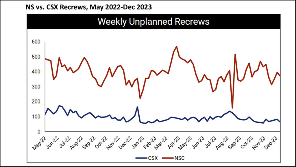 “Since the Surface Transportation Board (STB) began requiring disclosure of weekly unplanned recrews beginning in May 2022, Norfolk Southern has averaged more than 4.3x the number of unplanned recrews relative to CSX, despite having >800 more train and engine service employees.”