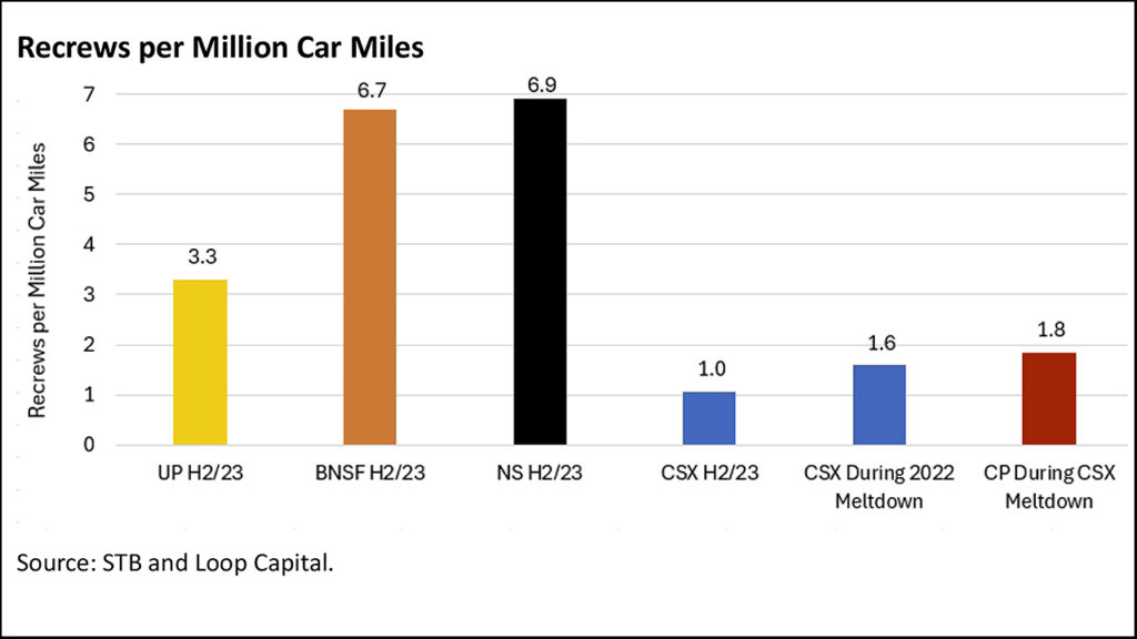 From July through December 2023, Union Pacific averaged 3.3 recrews per million car-miles; BNSF and NS were a little under seven; and CSX reported just one per million car-miles. At that time, CSX was certainly running better than the other three (with deserved kudos), so logically its recrews would have been lower. But three times lower than a well running UP and seven times lower than BNSF and NS? It’s possible, but a leap of faith in our view. We also want to be clear that we’re not defending NS in this analysis (defending railroads is not in our DNA). 6.9 was too high.