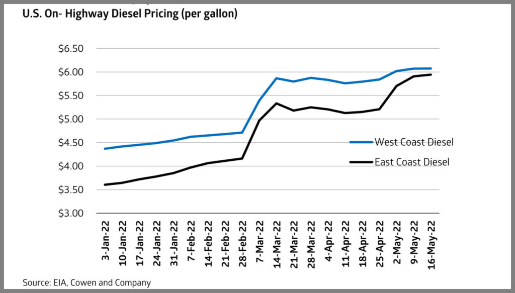 Weekly on-highway diesel prices (as reported by the U.S. Energy Information Administration, EIA) hit a national price of $5.61 per gallon last week and are more than 70% above prior-year levels. In terms of regions, the Eastern U.S. has been harder hit with prices rising approximately 84% (up more than 100% in New England), while the West Coast saw the lowest (but still high) increase at approximately 63%. (See charts below for year-to-date diesel pricing.)