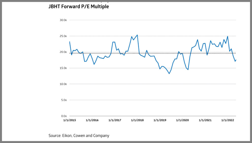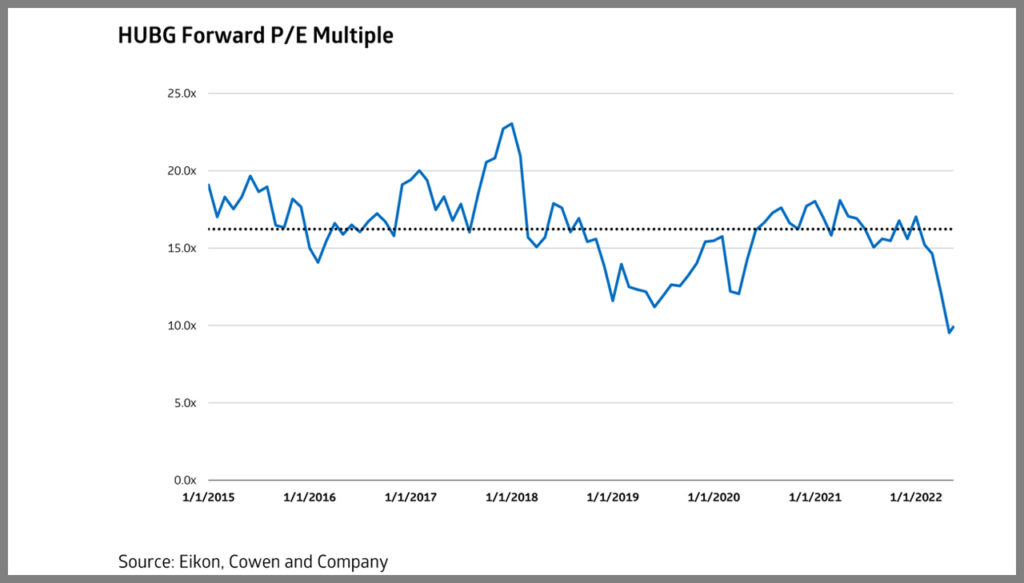 We also believe IMC’s like HUBG and JBHT will see benefits. HUBG is our top ESG pick this year and is currently trading approximately six turns below its historical forward P/E multiple, as seen below (along with JBHT’s forward multiple), representing an attractive entry point (in our view) for North American intermodal exposure for longer-term investors.
