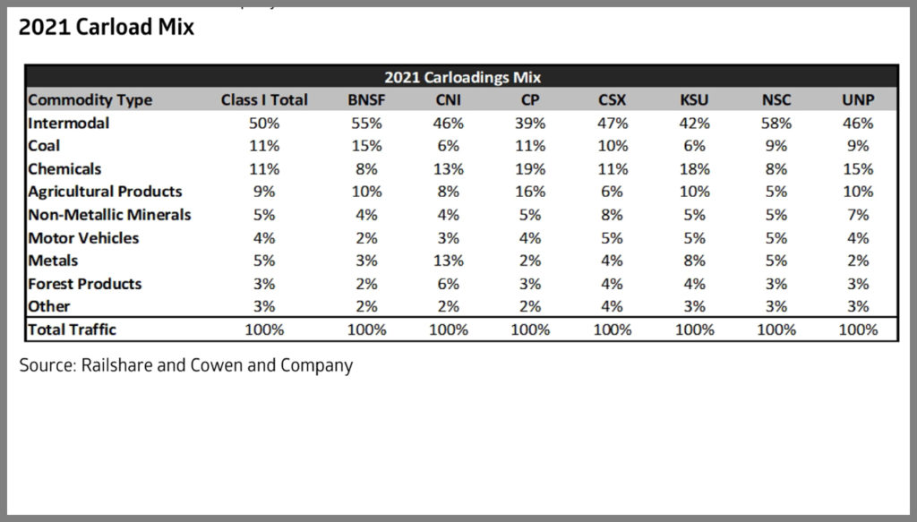 We believe sustained high diesel prices will ultimately benefit the railroads and IMCs. This should be especially true as we move throughout the year with anticipated improvements in the rail supply chain due to increased labor across the networks. The railroads set to benefit the most in our view are the eastern carriers, NS and CSX. They compete in a market with origin-destination pairings that are far closer, thereby having more truck competition. (See chart below on intermodal carload mix.)