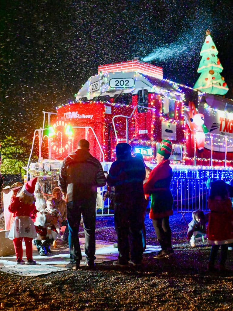 Santa also made it to Winterfest in Gonzales, Texas on Texas, Gonzales and Northern Railway’s (TXGN) Christmas Train. Two TXGN mechanics, father and son Danny and DJ Zaro, decked out Santa’s locomotive with colorful lights and inflatable decorations and capped it with a chimney and snow machine.