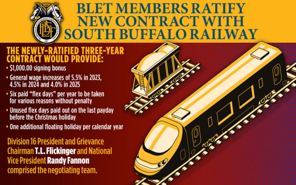 According to BLET, the new three-year agreement, which was tentatively reached last month, provides a $1,000 signing bonus and general wage increases of 5.5% in 2023, 4.5% in 2024, and 4.0% in 2025. The contract also provides members with six paid “flex days” per year to be taken for various reasons without penalty. Unused flex days will be paid out on the last payday before the Christmas holiday. Each employee will also receive one additional floating holiday per calendar year.