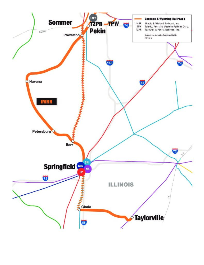Illinois & Midland is a Genesee & Wyoming (G&W) property that operates primarily in Peoria, Springfield and Taylorville, Ill., and interchanges with Class I railways BNSF Railway (BNSF), Canadian National Railway (CN), Kansas City Southern (KCS), Norfolk Southern (NS) and Union Pacific Railroad (UP), as well as the G&W-owned short line Tazewell & Peoria Railroad.