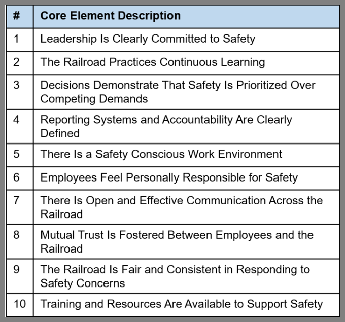 The 10 core elements of safety culture (see chart below) were measured across 10 railroads, using the Time 1 and Time 2 assessments. The findings included: