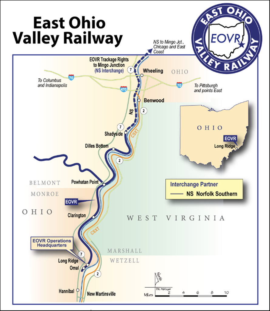 The expanded operations will extend EOVR’s existing 12.2-mile main line by 16.5 miles to Bellaire, Ohio, with operating rights over Norfolk Southern to Mingo Junction, Ohio for interchange. EOVR will also begin operating over 1.78 miles of NS’s Captina Secondary, running west from Powhatan Point.