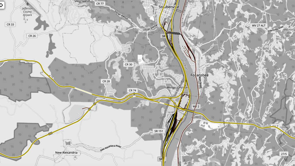 OpenRailwayMap.org closeup of Mingo Junction, where EOVR will interchange with Norfolk Southern.
