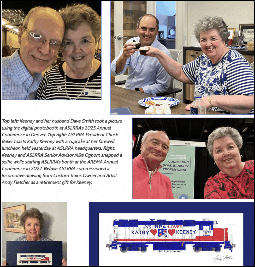 “Kathy has been a true joy to have as a colleague and her unique combination of relationships within the industry, support of short line railroads and their suppliers, and expertise in association membership, exhibitions, sponsorships and overall event planning and execution has been invaluable,” ASLRRA President Chuck Baker said. “She leaves huge shoes to fill, but not surprisingly she has also helped create an effective transition plan which has positioned the association and our members well for continued success. We’ve been so lucky to have her in the short line industry. We’ll miss her greatly but wish her well in retirement and know that she is only a phone call away!”