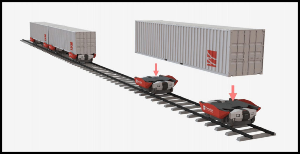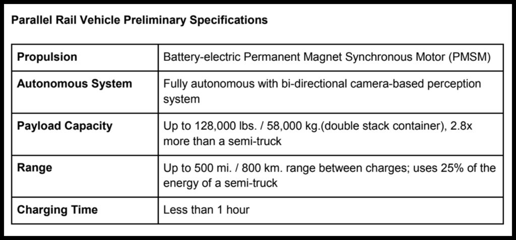 Parallel Systems’ patent-pending vehicle (see specs above) would “transport standard shipping containers as a single or double-stacked load,” the company said. Joined together, the individually powered railcars could form “platoons” (see rendering below) or split off to multiple destinations while en route. The platoons “do not need to accumulate large quantities of freight to make service economical, which enables more responsive service and a wider range of routes,” Parallel Systems said. “This dramatically reduces the waiting times associated with loading trains that are miles long.”
