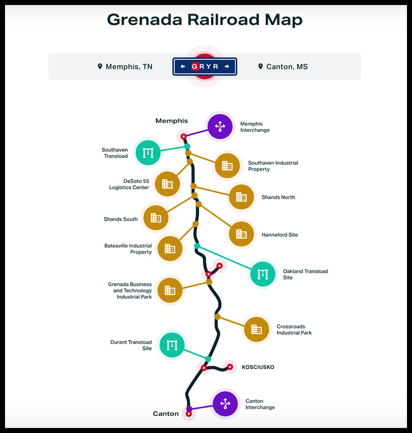 Targeted for abandonment by its previous owners in 2011, Grenada Railroad now operates 228 miles of track, running north/south along the I-55 corridor between Canton, Miss., and Memphis, Tenn. (See map, left.) It offers access to six Class I’s: CN, Union Pacific, BNSF, Norfolk Southern, Kansas City Southern and CSX.
