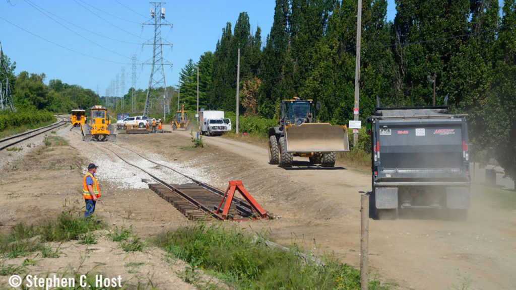 A new transload has just been completed north of Woodlawn Road for Flash Freight Systems of Ariss, Ontario, a new customer for the Guelph Junction Railway. This is Flash’s first foray into the railway industry for the trucking firm, which now has a 1,000-foot-long track that will be used to transload many commodities, starting with peas, potato flakes, lumber and cement. As soon as the track was completed, there were cars of cement waiting for the all-clear to be spotted to begin transloading. Keen observers will also note the Flash Freight track is right on the former CN right-of-way that once ran north to Fergus and Palmerston.